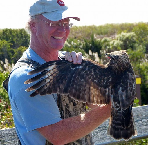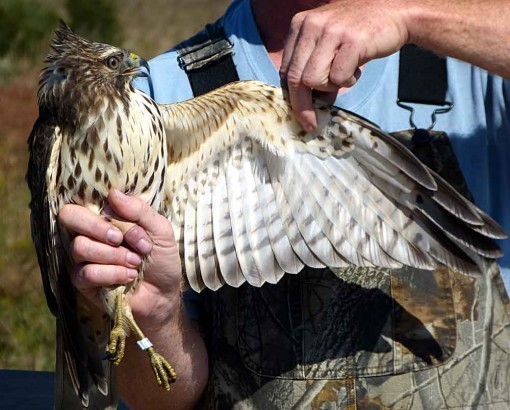 Here’s the bander (I neglected to get his name, unfortunately) showing the hawk’s wing. Notice the light section near the wing tip, this is called a “window,” an area which allows more light through. It can be seen even when the bird is soaring high overhead, just a silhouette, and a good way to identify the species.