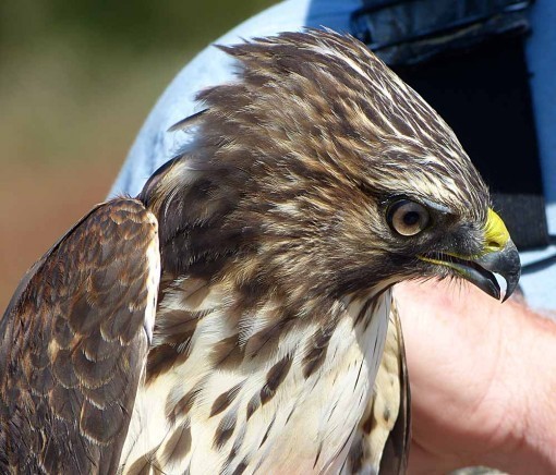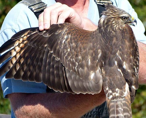 In this light you can see the beginnings of the rufous red beginning to show on the shoulders, the color that gives the bird its name. It will get a lot more of that color as it matures, and some on the front as well. Note you can still see the “window” in the wing tip. This bird was quite calm and cooperative. The bander said Red-Shoulders tend to bite, but this one didn’t try it. He thought it was probably a male because of the relatively small size for the species. In most raptors, the females are larger.