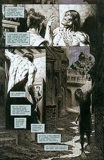 I’ve loved Wrightson’s art since I first discovered it in the early 70s, and his adaptation of Mary Shelley’s “Frankenstein” with lots of full-page illustrations is a wonderful showcase for his art. That alone pretty much sold me on this project, but I also like the writing of Steve Niles, another plus. Despite all that, I wasn’t quite sure what this story would be like. As I opened the book and began to read, the art immediately met with my approval. And the story? It opens at a circus sideshow where the Frankenstein monster is appearing as one of the freaks, and seems to kind of like the life he’s found there. With narration in captions by the monster, we go from that setting into a recounting of some of Mary Shelley’s novel, all from the monster’s perspective. Very well handled, completely respecting the original work as far as I can recall. Victor Frankenstein and his creation continue their struggles and arguments, their love/hate relationship to the monster’s apparent death at the end, though we know, of course, he didn’t die. And that’s what the title of the book says, after all.