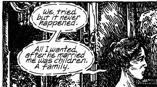 Clem told me, ” I liked the art a lot, but with all that cross-hatching, I thought it’d look lousy with computer lettering. I called Gaspar and asked him if he’d be willing to try it. I wasn’t sure he would be, but he was delighted. As it happens, the artist was a big fan of (Gaspar’s work on) ARKHAM ASYLUM, and couldn’t believe he would be interested in working on her pictures. Gaspar did the work on vellum overlays and mailed it to Michael in Canada, who scanned the lettering and sent it to Norway, where it was digitally combined with the artwork. For his part, Gaspar liked the story, so far as he read it, and loved the woman’s art.”
