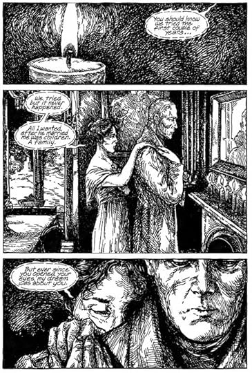 As I said, Bernie’s art is terrific, using a mix of pencil tones, gray washes and inks. At first glance it seems to be black and white with gray tones, but if you look closely, the art has been scanned in color, allowing for a much richer palette of warm and cool grays that add a great deal to the effective atmosphere of the book. For instance, compare the cool gray of the sky with the warm grays of the buildings above. This is the best new work I’ve seen from Wrightson in years, and I can’t wait to see more of it.