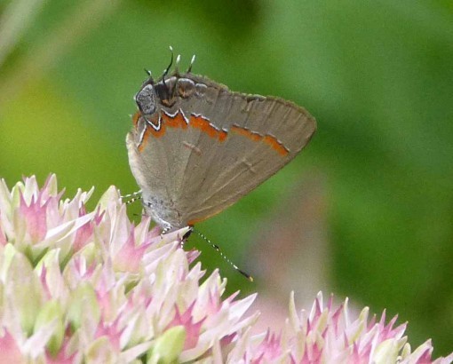 This Red-banded Hairstreak is also quite small, about thumbnail size. It’s one of the more common Hairstreaks, and one I expect to find feeding on our Sedum, as this one is, head down. The red band is obvious, the hairstreak refers to the little hairlike tails extending from the wings.