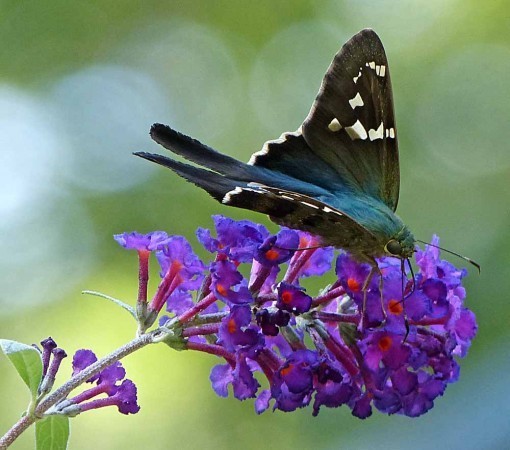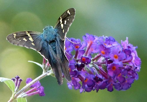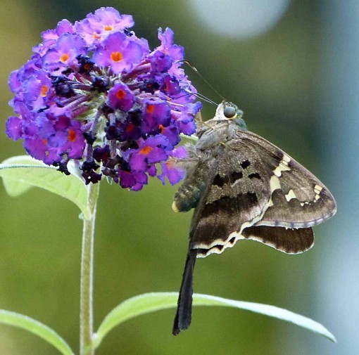 Most Skippers are boring, but when I spotted this one on one of our Butterfly Bushes, my heart skipped a beat. This is a Long-tailed Skipper, much larger than the usual ones, about two inches, with a cool blue feather-like covering on the back and those long tails at the wing ends. I’d only seen one twice before as far as I can recall, and it was a first for our yard.