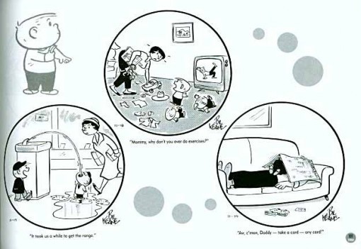 Bil Keane is still with us, and works on the strip with his son. The drawing style has become somewhat refined from these early days, but hasn’t changed hugely. The kids, especially, look pretty much the same. The parents have changed more. The restrictive nature of a single panel gag (occasionally two panels) means you have to come up with ideas that can be conveyed quickly. Some work better than others, but the best of these are right up there with good New Yorker cartoons, I’d say.