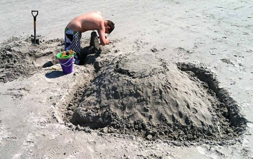 Being all caught up with work on Friday, I was able to spend the entire day at the beach with Ellen and her family. I decided it was time to do a large sand sculpture, the first of the summer (and perhaps the last). I marked out a roughly square area and dug around it to begin a mound. Not having any real inspiration, I decided to just go with a standard castle. Once the mound was begun and a platform packed down, I dug a round hole to reach water and really wet sand. Zach is standing in it here. Using double handfuls of this sand slurry I added further to the mound.