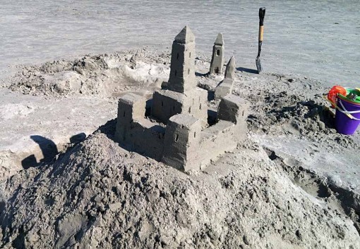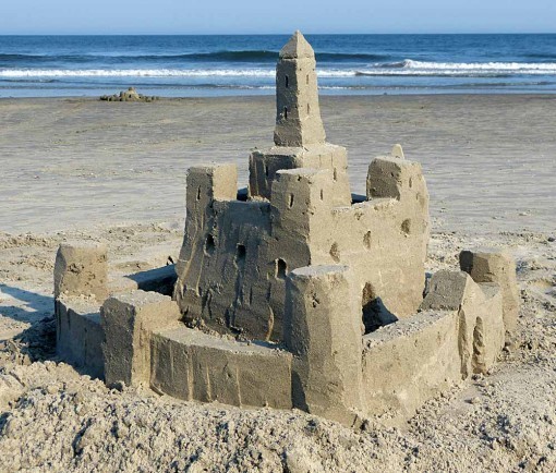 Here’s the finished castle after about four hours of work. I added an outer bailey wall with four corner towers and two smaller ones at mid points. The one on the right is meant to be an entrance gate. Windows were added with small scoops, and I dug out the space between the outer bailey and the inner bailey, adding to the height of the latter. This was all I had time for. If I had another hour I might have tried adding crenellations to the walls and towers by making a smooth slab of wet sand and cutting tiny cubes from it. Maybe next time.
