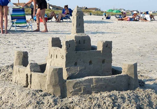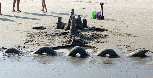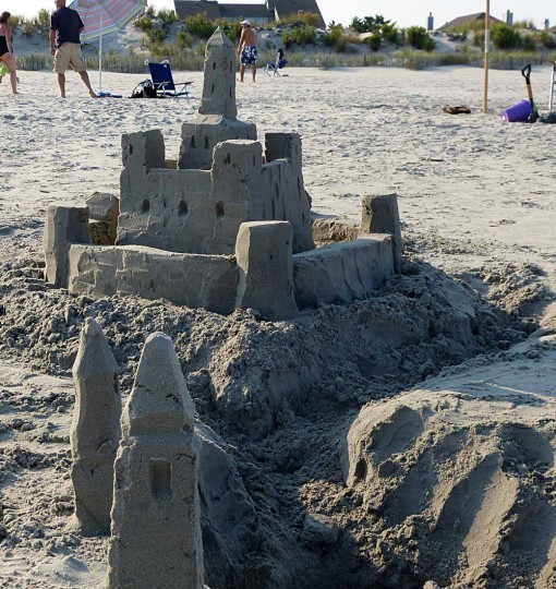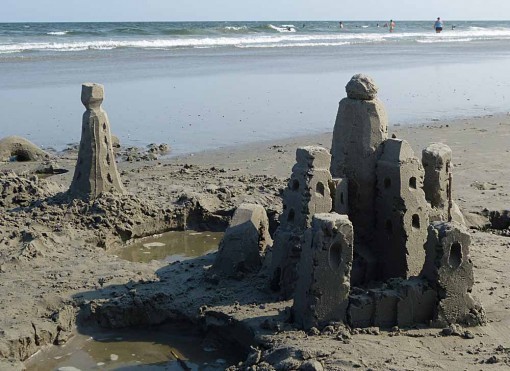 Another shot featuring Zach’s two auxiliary towers. It was time to go home, so I filled in the large hole as much as I could to prevent walkers from stepping into it by accident, and left the castle to its fate. In about another hour the tide would reach it, and if that or destructive kids didn’t finish it off, the beach rakers would that night. It’s an ephemeral art, but one I enjoy.