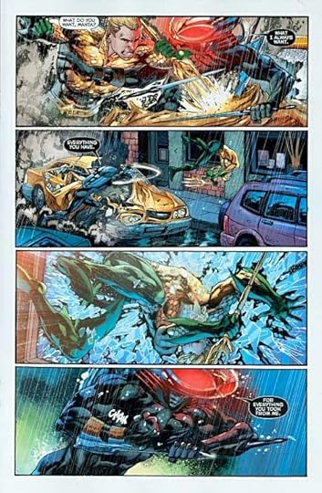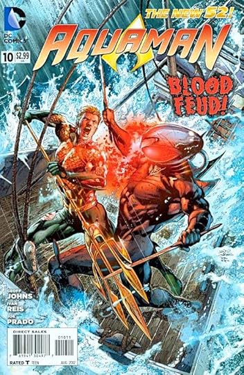 While I’ve never been a fan of long-time Aquaman villain Black Manta, I like the way Geoff Johns writes him in this issue. And I like the back story he’s revealing—through Mera’s interrogation of the scientist Shin—even more, giving the man under the odd helmet a good reason to hate Aquaman, and sharing out the guilt and anger on both sides. Meanwhile, Johns continues to explore the until now unknown superhero team that Aquaman once belonged to, who are now being hunted down by Manta and his gang. Good stuff.