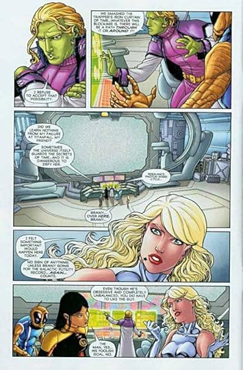 The Dominators have finally made their first attack move, kidnapping Brainiac 5 and Dream Girl, as you can see above. As you might expect, they put up a good fight against the alien creatures sent to grab them, but in the end are carted off to a Dominator homeworld. The rest of the Legion is caught off-guard (clearly they haven’t been reading the last few issues), and arguments develop over what to do next, with some wanting to wait for more info, others ready to rush out for a rescue.