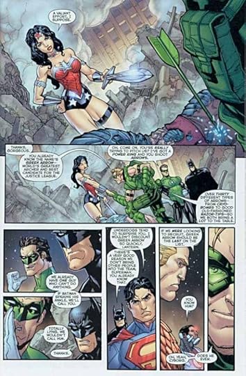 Green Arrow wants to join the team. Argumentative and disfunctional a group as they are, they seem united on one thing: he’s not wanted. As a Justice League fan since the group’s beginning in the early 1960s, it’s hard not to contrast this issue with the introduction of GA to the original JLA in issue 4 of that series. Here, instead of camaraderie and helping each other, all the team members are mean and dismissive to GA, even as he tries to help them. Eventually he gets the message and moves on. Meanwhile, we get snippets of past adventures which seem more interesting than the one we’re actually reading here, like the team’s encounter with the Martian Manhunter. We drop into ongoing missions without much explanation, and get booted out of them again as the team leaves GA and us behind, going on about their business. In a way it’s kind of like we, the readers, are being dissed, too. As you can see, I wasn’t fond of this storyline.