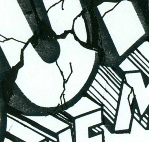 I made several photocopies on my own copier, cut them up with a scissors, and pasted the pieces onto another piece of paper to make up a broken, jumbled version of the logo. I copied this collection again to have a smooth working surface, then I inked in connecting pieces and lines and added lots of cracks.