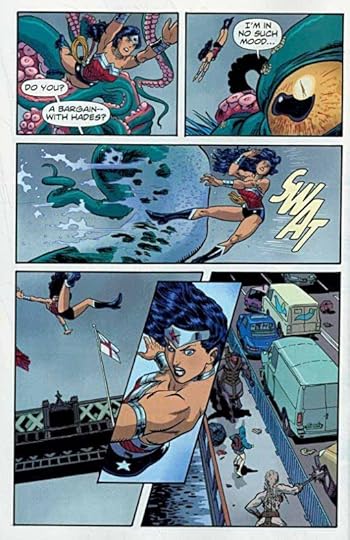 Until this issue I found writer Brian Azzarello's versions of the Greek gods entertaining, but somehow they're beginning to lose credibility for me. I mean, it's a fun idea revamping the Greek pantheon, but the forms and personas chosen are in some cases so far from what we all know about these gods and goddesses that I cease accepting them. Poseidon as a huge sea monster was a stretch, but at least he's in the aquatic ballpark. But Hades as a boy in armor with flaming candles on his head, and his eyes covered in wax? What's that supposed to represent? Playing against expectations is great once in a while. Neil Gaiman's take on Death is a good example. But the rest of The Endless are much closer to what you might expect from what their essence represents. Here, every Greek god and goddess we've met, with the possible exception of Hera, is completely contrary to expectations. It's a deal breaker for me, I can no longer take the storyline seriously.