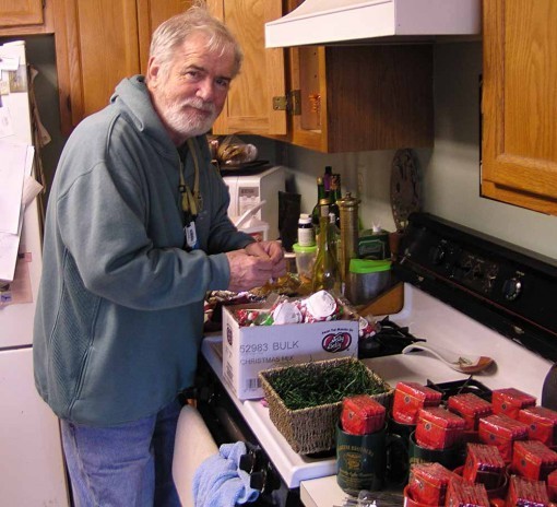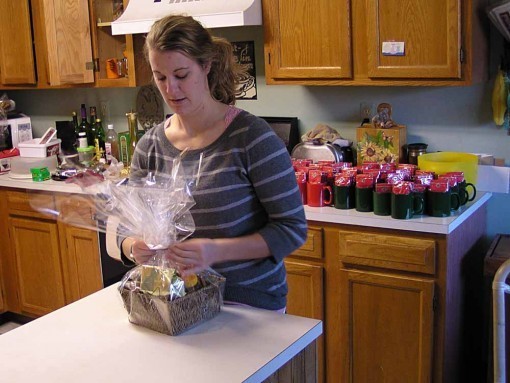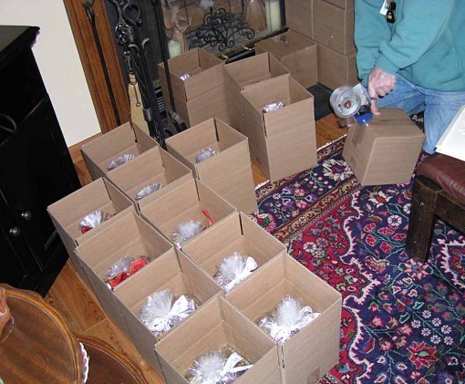 She gave the wrapped baskets to me, and I cut off the excess cellophane, tied on the decorative bows, and put the baskets in the shipping boxes. Dave then added the gift labels and closed them up.