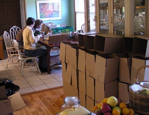 Here are Ellen and Ann in the Elves' Workshop packing baskets. On the right are the 59 shipping boxes I've just prepped.