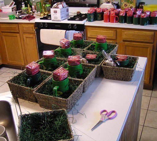 The baskets first had to be partially filled with straw-like "green fluff," and the first item in was a ceramic coffee mug with some bagged tea.