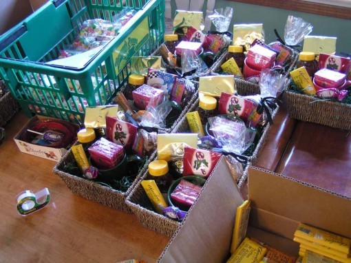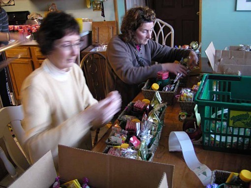 Ellen and Ann continued filling baskets with more goodies: a bag of coffee beans, cookies, chocolate, cocoa, honey, and several kinds of candy.