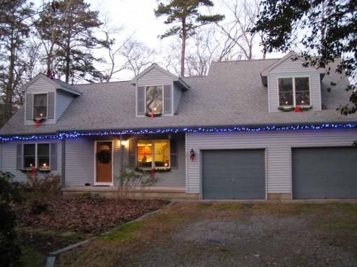Our outside Christmas decorations are minimal, but I do like to have a few lights up and some artificial garlands with red bows under the windows. I'd been using those icicle lights the last few years, but when I got them out today they were a tangled mess, and some of the bulbs were coming apart, so I scrapped the lot and bought these blue LED lights to run along the front eaves instead. We also use electric candle lights in the windows, the kind that have a light sensor so you don't have to turn them on and off. My goal is always to have something out there I can put up and take down inside two hours. We have neighbors that go all out, more power to them. For me, I'm happy with this.