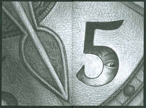 This has been out for a few years, and I keep looking at it in the bookstore, and liking it, but hadn't bought it until recently. It's an unusual mix of storytelling media. About half the book is text, telling the story in that way, the other half is wordless full-page pencil illustrations that also tell their part of the story sequentially, much like the old Lynd Ward woodcut novels, or of course, comics (in wordless sequences). I wasn't sure if the two would make for a good partnership in telling a single story, but in fact they work quite well. Here's an example: