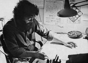The best photo of Jim himself at work, with lots of pens, pencils, and other drawing tools in the background.