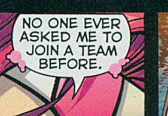 Actually they're paired circles, perhaps meant to represent Mandlebrot set shapes, or just bubbles, but neither explanation seems to fit her powers particularly. Maybe pink was a bad color choice, as they do look like hearts until you examine them, and I continued to read her dialogue as very lovey-dovey because of that, which I'm not sure was the intention.