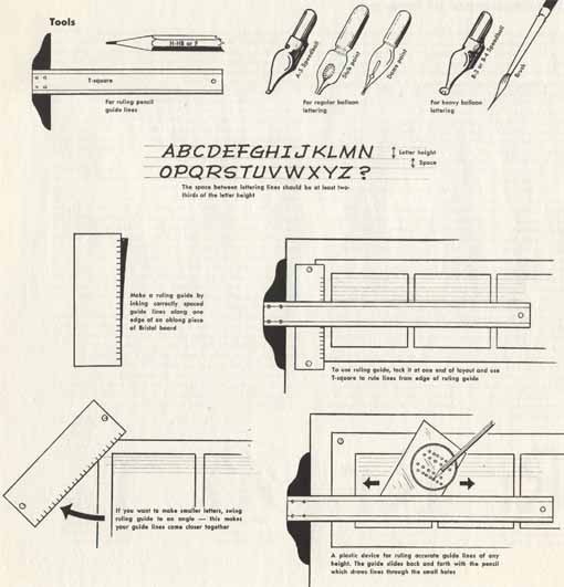 As the course gets down to the practicalities of balloon lettering, they again show some dip pen points. I've used Speedball B-series points for larger balloon and display lettering, the others I don't think I've used. Some I haven't seen. For drawing guidelines they show a simple method of using a marked-out paper guide, as well as the plastic Ames Lettering Guide at lower right, though used incorrectly! I did a one-sheet lettering guide myself many years ago that has the correct position, you can find it HERE. I'm guessing the artist had never used it himself.