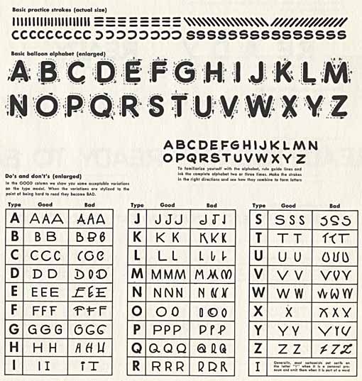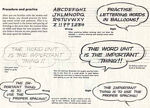 Finally we get to putting lettering into balloon shapes. Whoever did these samples has a style with some nice bounce that would look fine on a humorous comic strip. Interesting that he chose a spelling of the word practice (practise) that is much more common in England than here. Also, he did not follow the advice for the letter I with crossbars from the previous diagram of Good and Bad Lettering, where it says, "Generally, most cartoonists put serifs on the letter "I" when it is a personal pronoun and omit them when it is a part of a word." Something I've been saying for many years, and nice to see it reinforced here.