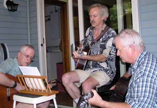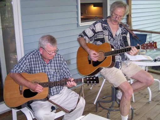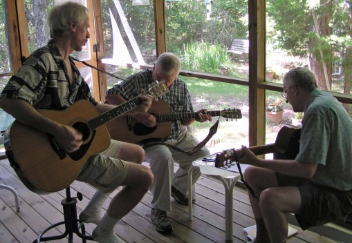 But now, for the first time in about 40 years, we were all together again, reminiscing and having a great time. Ellen joined us for lunch, and then took pictures as we got out our guitars (Tom's was borrowed) and played together on our screened porch. Since we had nothing prepared we mostly look at old handwritten lyric sheets with chords or songbooks by groups like The Lovin' Spoonful and The Beatles. Each of us had songs we liked to suggest, and it was great fun.