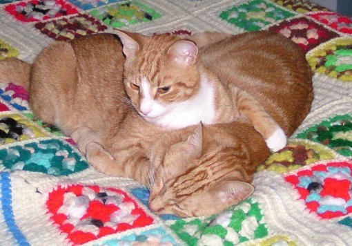 I ran the above picture last fall as an example of how brothers Tigger and Leo are still pals as adults, just as they were as kittens. They don't spend much time close together like this, but I think it's somewhat unusual that they do so at all. We've never had siblings before, but in my experience all adult cats tend to be somewhat standoffish toward other cats, unless they're cold and need another cat to snuggle with in the winter.