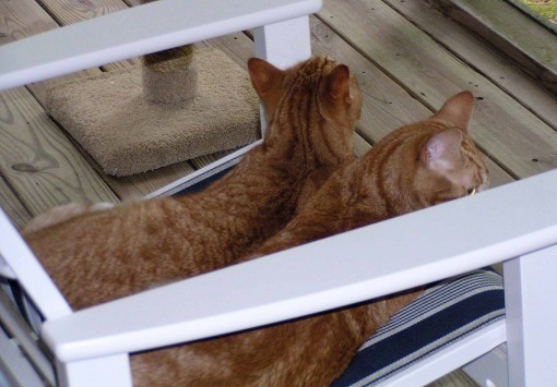 It's hot summertime here now, but the pair will still lie next to each other sometimes, as here on the rocking chair on our porch last week…