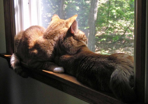 …and again today crammed onto the same windowsill in my studio. It's quite an adorable trait, and it makes us smile when they do it. Anyone else out there have sibling cats, and do they like to snuggle up to each other? I'm curious to know.