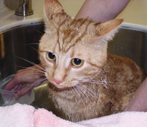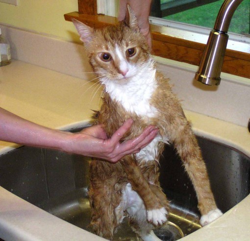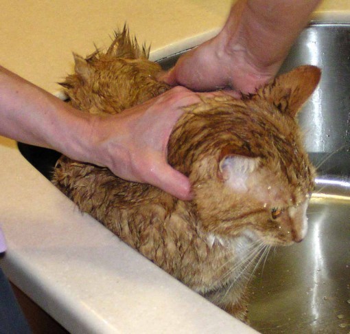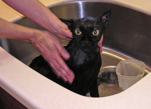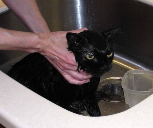 Once a year whether they like it or not (and believe me, they do NOT like it!) our three cats get a bath. Ellen always does it this time of year, when the weather is warm to avoid the chance of a chill causing illness, and before our summer beach visitors arrive, some of whom are allergic to cats. Bathing them helps cut down on the allergy symptoms. Katie, our long-haired black cat looks the funniest when wet.