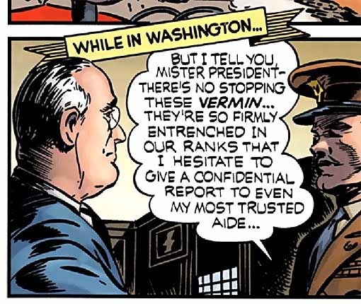 In 1939 … we brought in a letterer, too. The letterer's name was Howard Ferguson, and he was the best ever in the business. Howard was from Detroit. His wife had left him, and he came to New York with his daughter Elsie, who was his pride and joy. She was maybe eight or nine years old at the time. Howard's mother was an "America Firster," one of the people who pressured the government not to get involved with World War II. The group had been organized by a Yale student. Its ranks included future President Gerald Ford and Sargent Shriver, the man who founded the Peace Corps. Howard didn't agree with the Firsters, so he had a lot of heated arguments with his mother, and held a lifelong grudge against her.