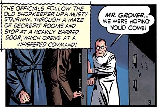 This unusual panel layout from page 4 works well, and shows Kirby's love of machinery. The only thing I don't like about the lettering is the initial capitals in the first two captions. First, they both lean away to the left, second, each is in a different style.