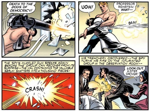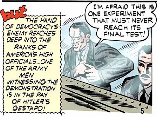 Okay, Ferguson has his fans, so let's look at some of his work on CAPTAIN AMERICA #1, cover dated March, 1941. I put the contents page at the top of this post, and it's quite good, with a variety of styles that work together well, and solid, handsome regular lettering. A fine start to the issue and the work of Ferguson.