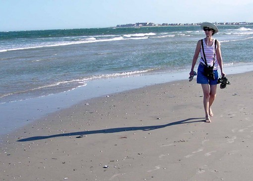 Most New Jersey beaches are crowded with people this time of year, but in a few places there are beaches where no swimming is allowed, and where the birds have a chance to enjoy the seaside as well. Here's Ellen collecting some large clam shells on our walk at Stone Harbor Point late yesterday afternoon, one such place.
