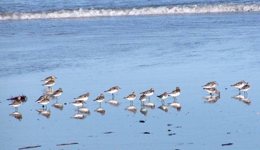 After gulls, the most common beach birds are Sanderlings, those little shorebirds you see running back and forth with the waves, even on beaches with quite a few people. These are enjoying some rest time, and perfectly reflected in the wet sand.