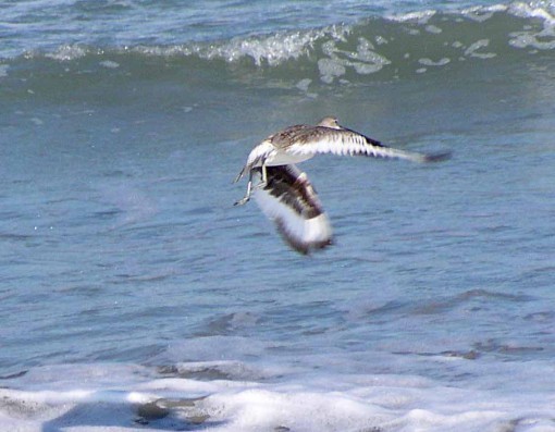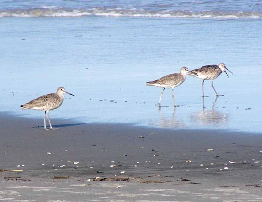 Willets are much larger shorebirds that we rarely see on the beach itself, they're usually in the back bays feeding on the mud flats. Despite their large size (almost as big as the average gull) they have no distinctive marks when standing.