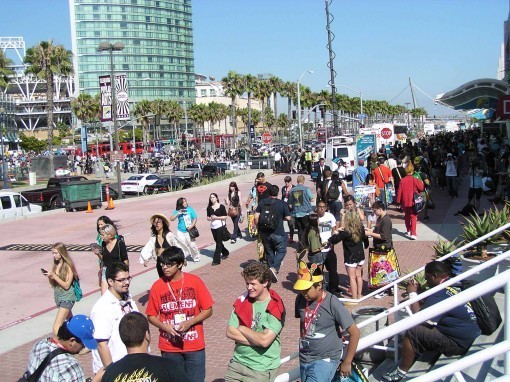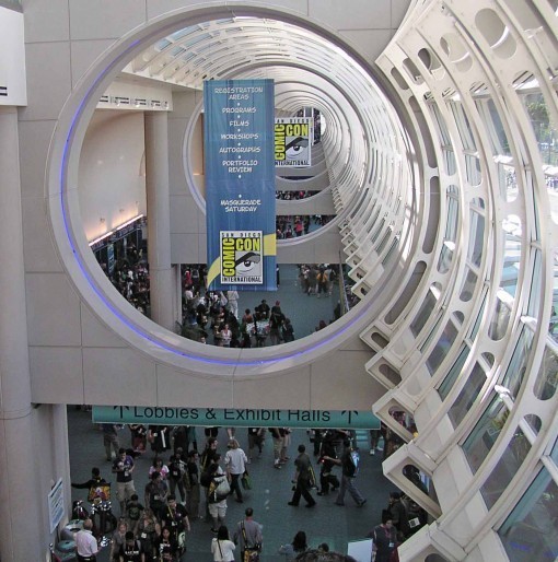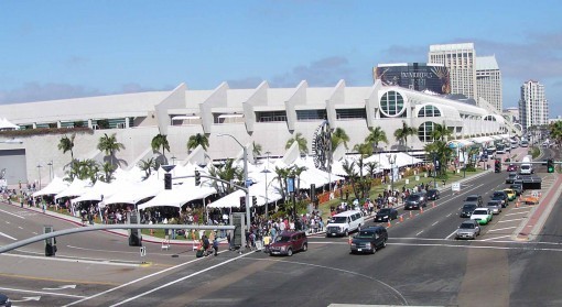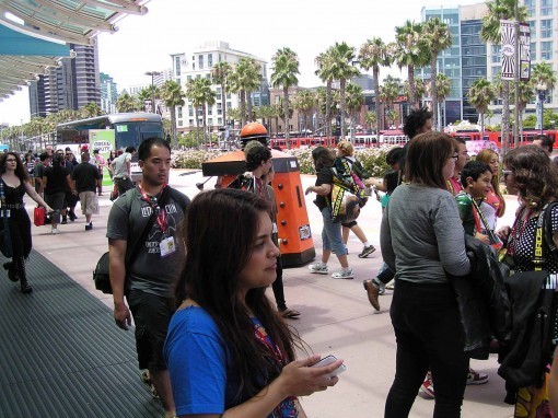 What is usually the longest day of my year began when my alarm went off at 4 AM. I showered, shaved, dressed, had a bowl of cereal and orange juice, brushed my teeth, got my bags into the car, kissed Ellen goodbye, and drove to the airport in Philadelphia for my trip to San Diego Comic-Con International, getting to the gate around 7:40 for an 8:20 flight. I flew Southwest for the first time this year, and it was fine. Their egalitarian approach to seating was different, but worked well: no seat assignments, just a boarding order, then you choose your own seat. No first class, everyone's equal. I connected through Phoenix where I had time for a pretty good sushi lunch, and arrived in San Diego around 1:30 PM. Took a taxi to my hotel, where they didn't have a room ready for me yet (but I expected that), so checked my larger bag after putting the heavier stuff from my smaller bag into it, and headed to the shuttle bus to the convention center.