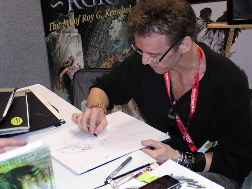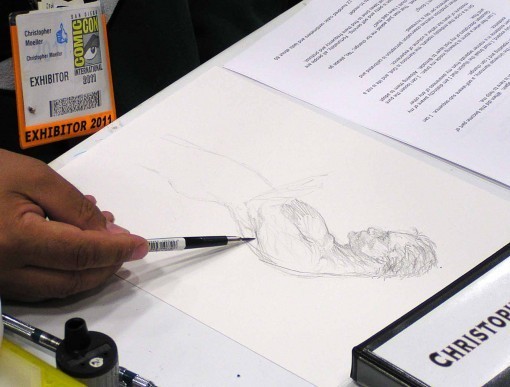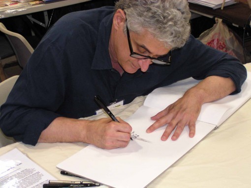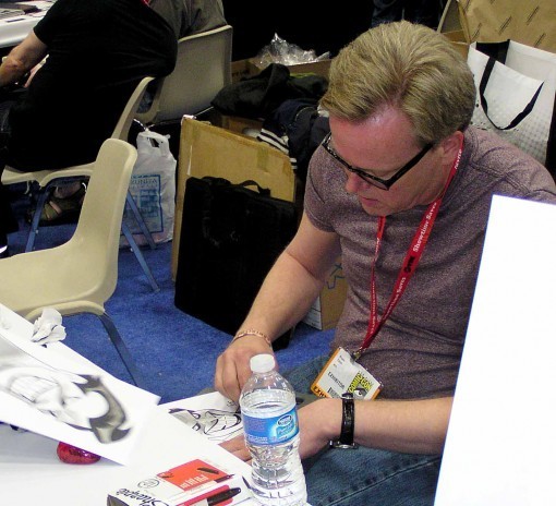 Back in the Exhibit Hall I said hi to artist Bill Sienkiewicz (whose name I learned to spell correctly long ago) and watched him sketch a bit. Interesting technique, using almost the side of a marker point.