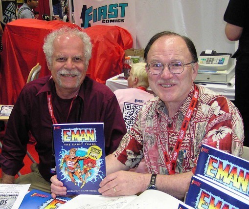 I was very happy to see old friends Nick Cuti and Joe Staton signing copies of their newly reprinted E-MAN collection, marking the return of First Comics. This reprints the original E-Man run from Charlton Comics in 1973-74, a favorite of mine at the time, and I had to buy one and get it signed by them. I hope it's as much fun to reread as it looks, I think it will be. And the reproduction and new coloring are excellent. Joe told me he still has nearly all the original art, so it was newly scanned for this edition.