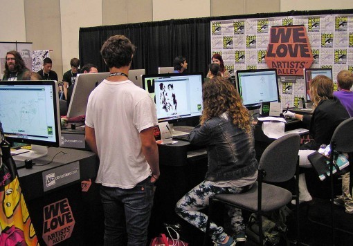 Something new in Artists' Alley this year was this group of about six digital workstations sponsored by DeviantArt.com. They were being used by artists to create digital art, and fans as well.