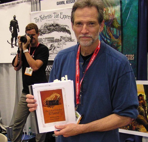 Here's Gary Gianni with an upcoming project, a lavishly illustrated version of H.P. Lovecraft's "The Call of Cthulhu." Behind him is a poster promoting another project with Ray Bradbury that looks great.