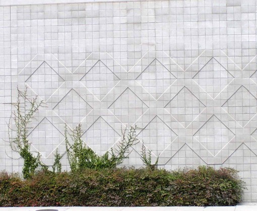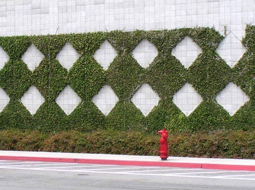 Walking around the side of the Con Center to the back, I found this interesting. All around the center there are these patterns in the concrete block walls, and the groundskeepers have ivy growing on them. This is a new batch just starting…
