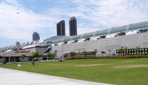 You can really see how massive the Con Center is from the bridge, looking west. Way down at the end, barely visible, is the part in my first photo above. And in the small grassy park tents were up to shade people waiting in line for the big movie cast events in Ballroom H.