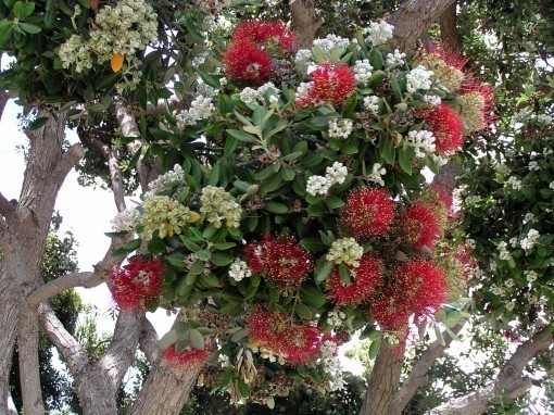 The park is lovely, with grassy lawns, benches, and exotic trees, this one in improbable bloom.