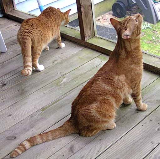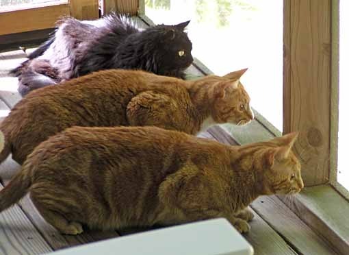 As if the squirrels, birds, bugs and turtles weren't enough to keep them busy, the cats are now focused on a new visitor to the yard…