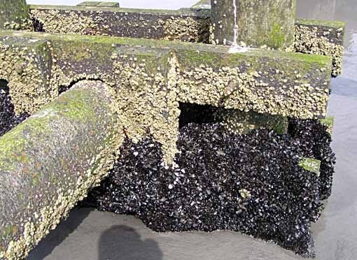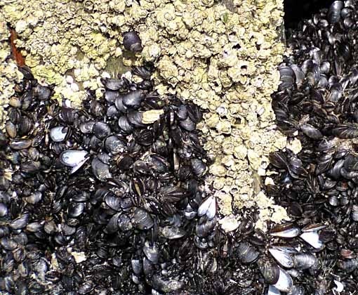 We went to the beach Saturday for the first time this summer, and from that you might normally expect pics of the waves, sand, shore, maybe family shots. I did take a few of those, but these nature shots interested me more. There are storm sewer outflow pipes on the beach where we go to swim, and covering them are massive colonies of two shellfish species: barnacles (the lighter ones above) and mussels (the darker ones below). Each seems to have it's particular comfort zone and habitat.