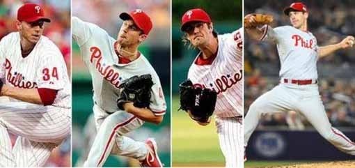 We missed watching the opening day game because of a mislabeled cable channel recording, but enjoyed last night's game. The much touted four ace pitchers, above, Halladay, Oswalt, Hamels and Lee, are off to a good start. We'll be watching as often as we can, and hope to get to at least one game this year. Go Phillies!