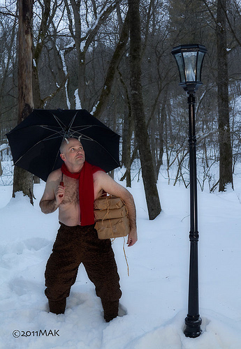 If you're a regular reader of Neil Gaiman's blog and twitter feed, as I am, you might remember that the snowy woods on his property reminded him greatly of the ones in C.S. Lewis' first Narnia book, "The Lion, The Witch and the Wardrobe." All it needed was a lone lamppost, and as often happens in Neil's magical life, one was located that runs on solar power, which Neil's family gave him for Christmas. It was soon installed in the woods, looking so very Narnish. Now some friends have posed as characters, including this charming fellow as Tumnus the Faun. Read more HERE.