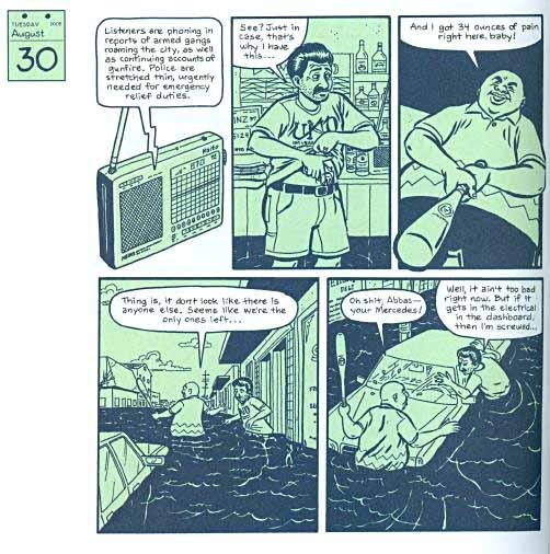 The standout for me is an excerpt from ASTERIOS POLYP by David Mazzucchelli, which I've already raved about on this blog. I also really liked the excerpt from R. Crumb's THE BOOK OF GENESIS, and one from A.D.: NEW ORLEANS AFTER THE DELUGE by Josh Neufeld, above. Others I liked with a bit less enthusiasm include entries by Peter Kuper, Jonathan Ames and Dean Haspiel, Gilbert and Mario Hernandez, Michael Cho, C. Tyler, Fred Chao and Peter Bagge. I read the excerpt from Chris Ware's ACME NOVELTY LIBRARY and had my usual reaction: love the art style, hate the writing, the lettering is beautifully done but much too small. If your eyes are younger, and your taste differs, you may find it the highlight. Any anthology is going to have hits and misses for each reader, but I think the chances of more hits than misses is quite good for this one. Would I put it ahead of a favorite series? No. But if you'd like to see some of what else is out there, it's a great sampler. Recommended.